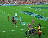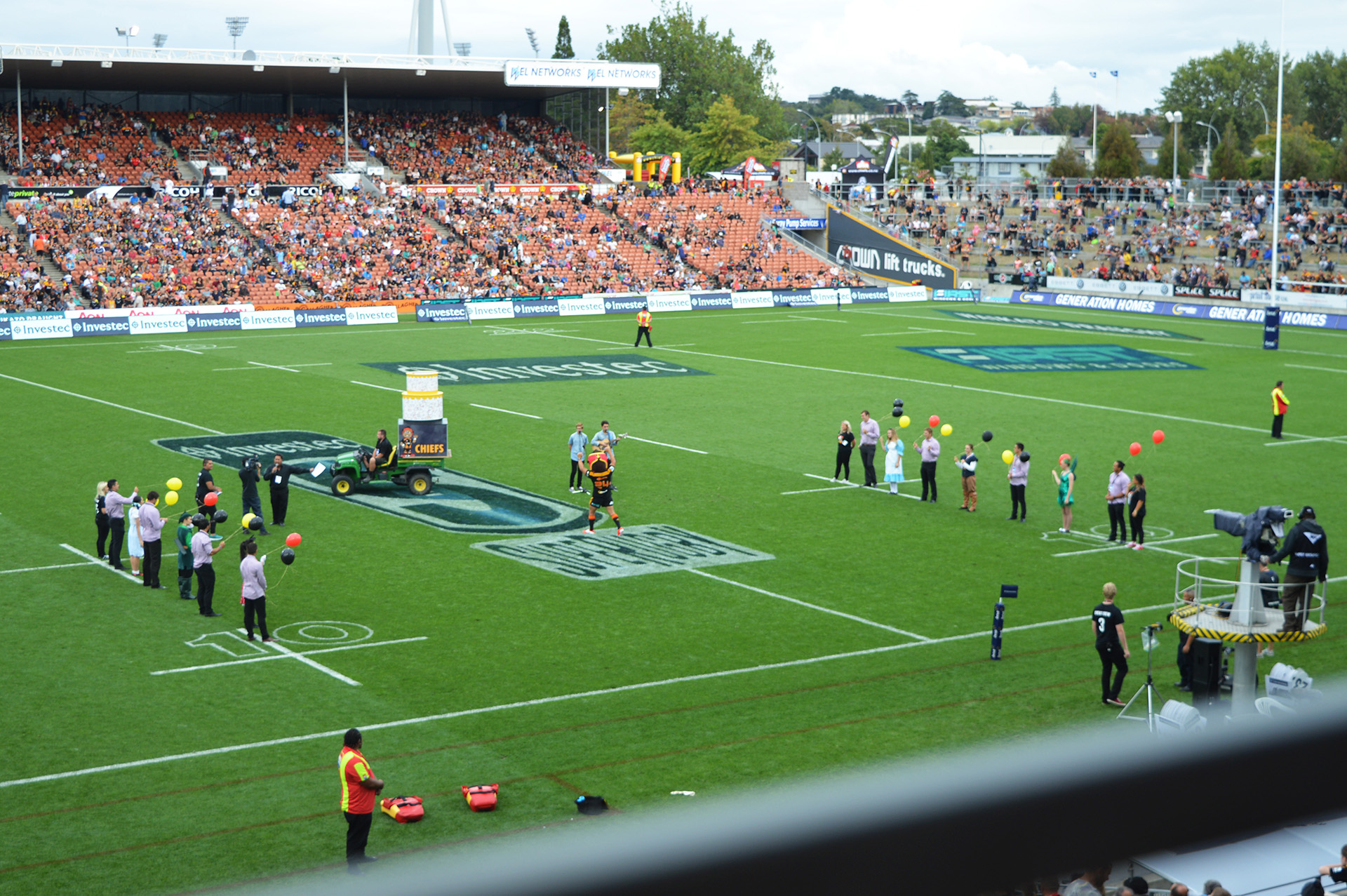 A notre arrivée nous assistons à une danse traditionnelle maorie d’encouragement aux joueurs et c’est très émouvant. Il ne s’agit pas du célèbre Haka des All Blacks mais celui de la tribu de la région. En effet chaque iwi (tribu) néozélandaise possède sa propre dance traditionnelle. Une fois les joueurs entrés sur le terrain sous les acclamations des guerriers et les applaudissements de la foule le jeu commence. Les Chiefs d’Hamilton affrontent les Cheetahs d’Afrique du Sud et cette