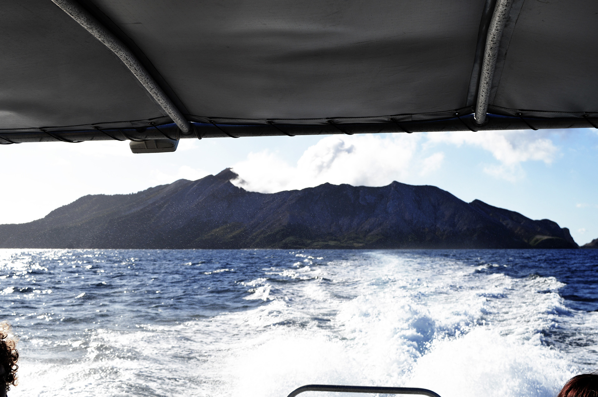 De retour sur le bateau, le capitaine nous fait faire le tour de l’île. A certains endroits, nous pouvons sortir à l’avant du bateau pour prendre des photos, profiter de la caresse de l’air marin et soufré sur nos joues, mais aussi pour voir de grosses bulles jaillir du fond marin puis remonter à la surface pour exploser.