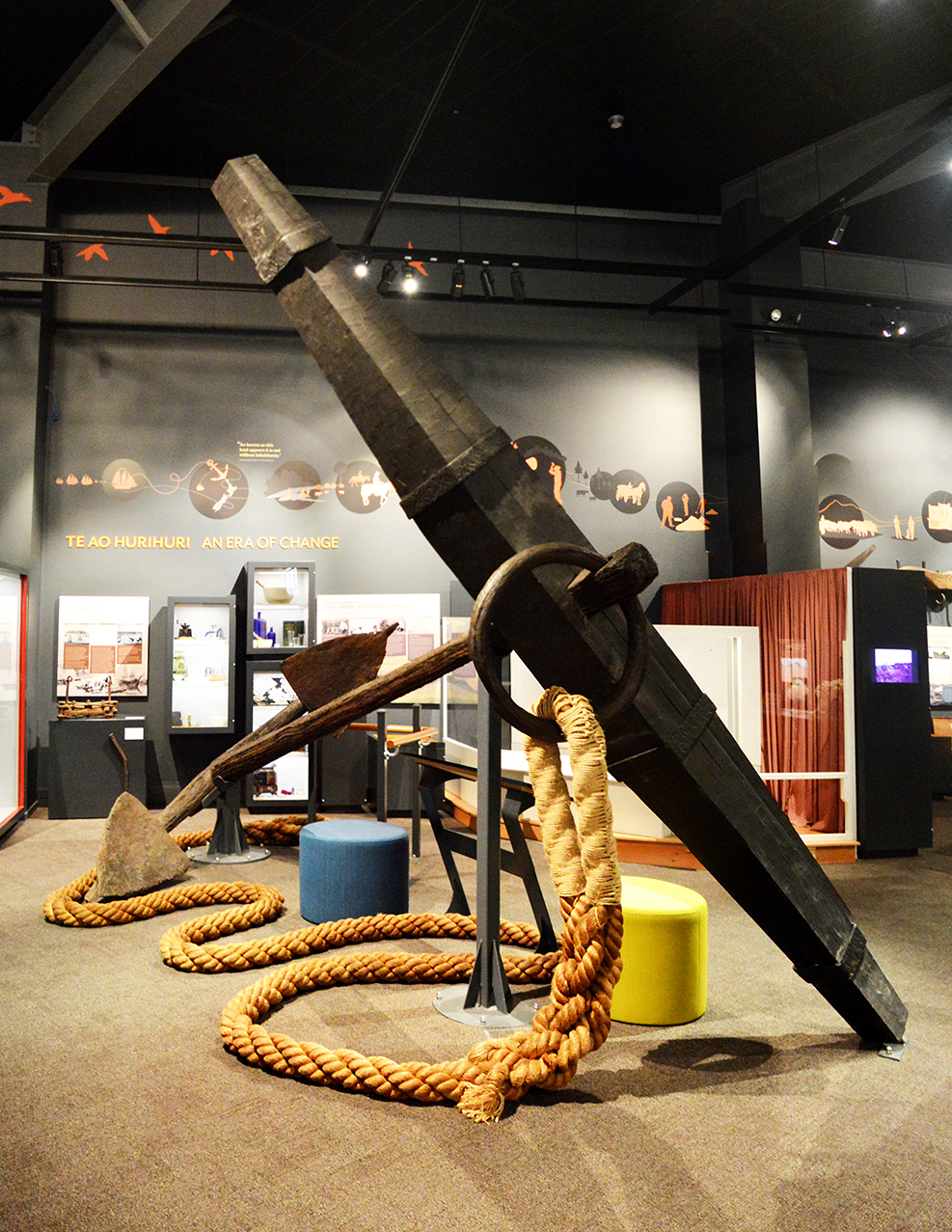 Le premier jour à Kaitaia est quelque peu pluvieux aussi nous décidons de partir visiter le petit musée de Te Ahu. Nous apprenons beaucoup du conservateur (?) du musée qui nous accompagne dans notre visite, très intéressante. Le musée est vraiment tout petit, mais contrairement à ce que nous avons l’habitude de voir (je parle des musées des petites villes), celui-ci est très bien conçu ! La muséographie est très bien pensée, les vitrines ne sont pas surchargées et les objets sont bien éclairés et accompagnés d’explications. Nous sommes vraiment surpris et heureux de la qualité présentée. Ainsi nous voyons, entre autres, une riche collection de « gums » de kauri, des objets de l’époque coloniale qui ont servis à leur extraction, deux squelettes de moas et deux pièces uniques qui font la fierté du Far North : l’ancre du bateau du baron de Surville, qui est gigantesque, presque intacte et qui est le seul témoin de ce type de l’arrivée des Européens, ainsi qu’une sculpture maorie datée entre les 14ème et 16ème siècles, ce qui fait d’elle le plus ancien vestige maori connu à ce jour et en tous cas le plus démonstratif de l’art maori originel (son style est similaire mais présente des petites différences par rapport aux autres sculptures plus contemporaines). Nous avons également le privilège d’assister au cérémonial de « bénédiction » de la sculpture qui a lieu chaque matin et soir… Nous sommes beaucoup touchés par l’invitation du personnel du musée et y assistons avec un profond recueillement.