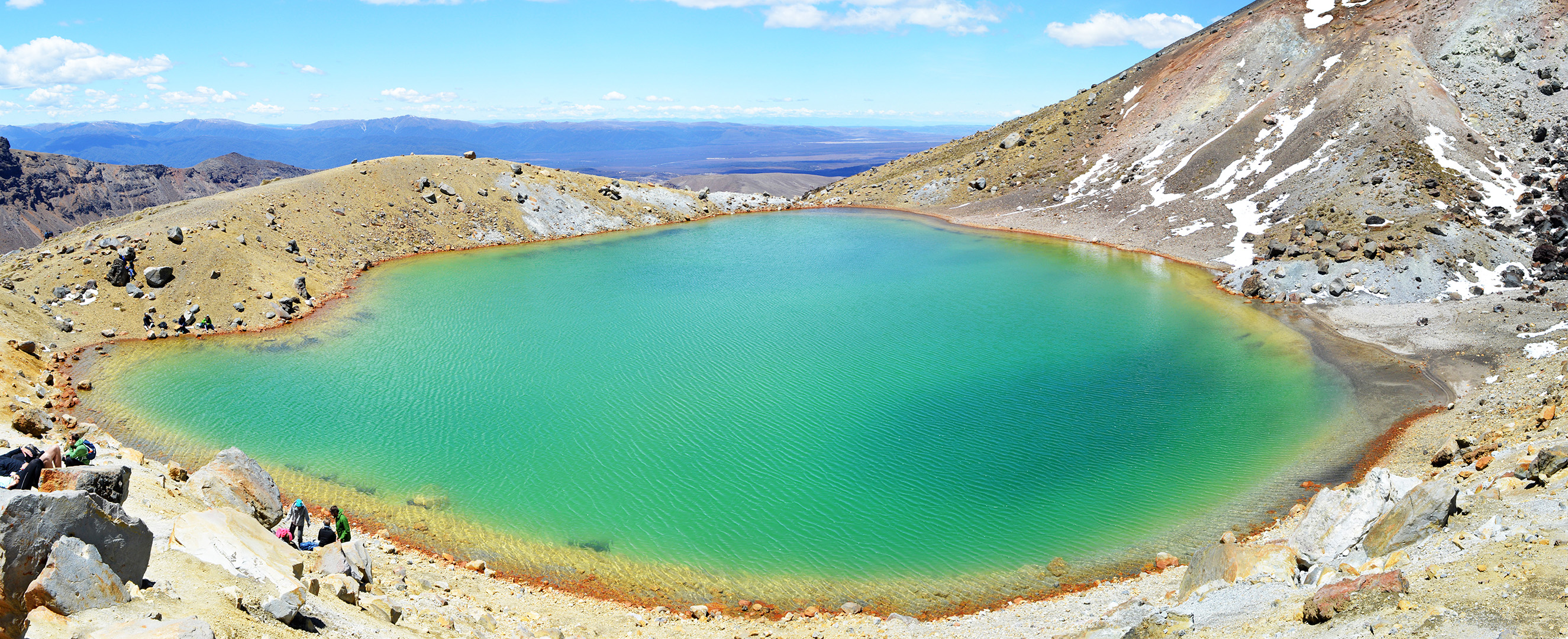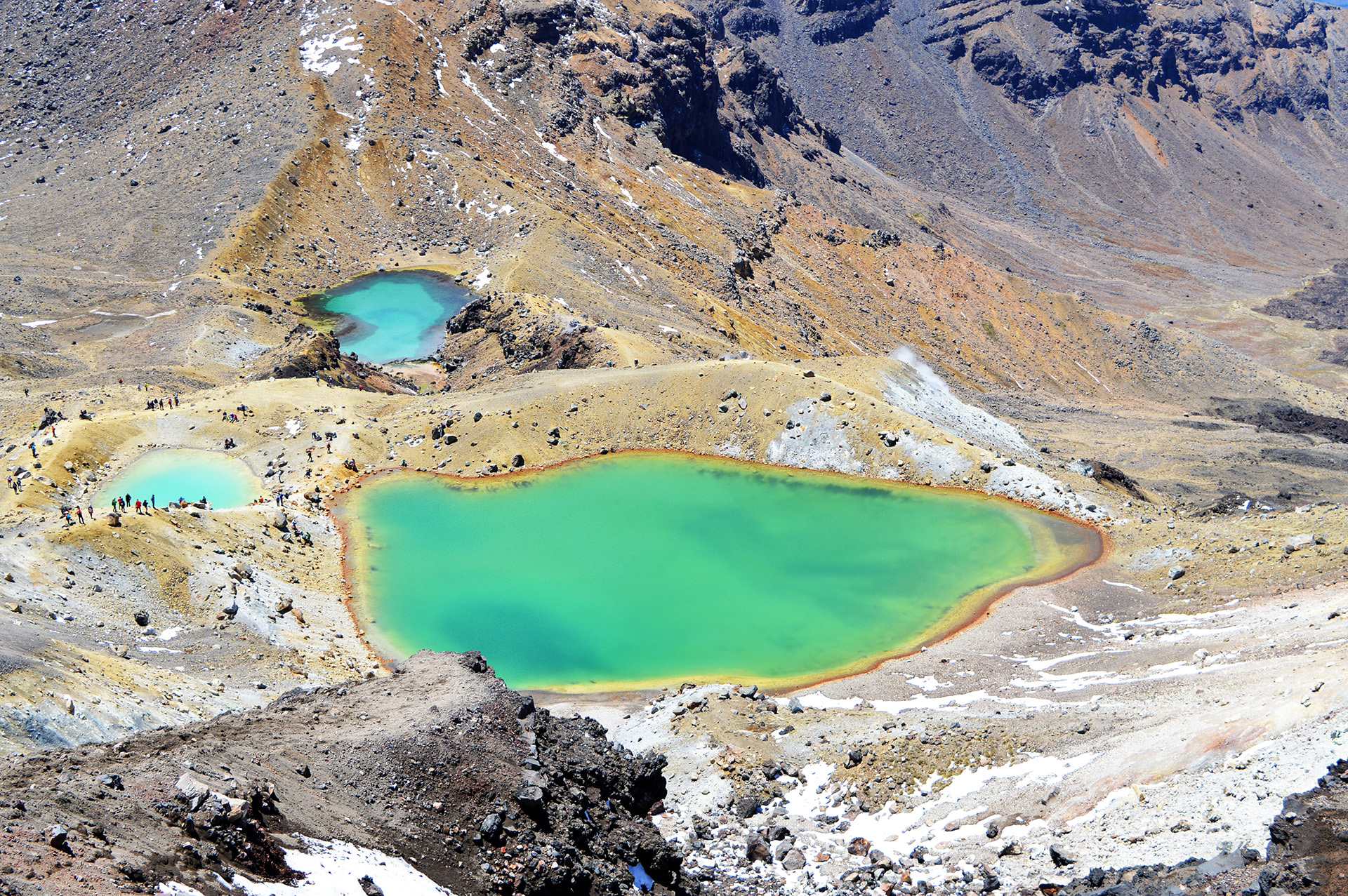 Aujourd’hui nous sommes levés à 6h du matin pour attraper le bus qui nous conduit au départ du Tongariro Crossing, considéré comme le plus beau treck au monde. Un peu inquiets car nous n’avons jamais marché sur une aussi longue distance, nous prenons le célèbre chemin de randonnée. Célèbre, voire même trop célèbre, car à notre grande surprise (et déception) des centaines de touristes sont venus découvrir ou redécouvrir le treck. C’est impressionnant et parfois agaçant car personne n’avance au même rythme et étant personnellement plutôt lente en montée, je dois souvent m’arrêter pour laisser passer les plus sportifs. Malgré ce point négatif, et la marche au combien longue et fatigante, nous passons un des plus beaux jours de notre voyage. Le temps est tout simplement idéal : soleil, soleil et soleil ! Pas un nuage en vue, ce qui nous permet d’apercevoir tous les sommets du parc, mais aussi celui du Mt Taranaki (le Mt Fuji néozélandais), situé à plusieurs centaines de kilomètres de là ! Le long des 19,4 km, nous traversons différents paysages : plaines immenses recouvertes de tussock, pentes sombres, vestiges d’anciennes coulées de lave, vastes