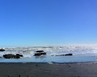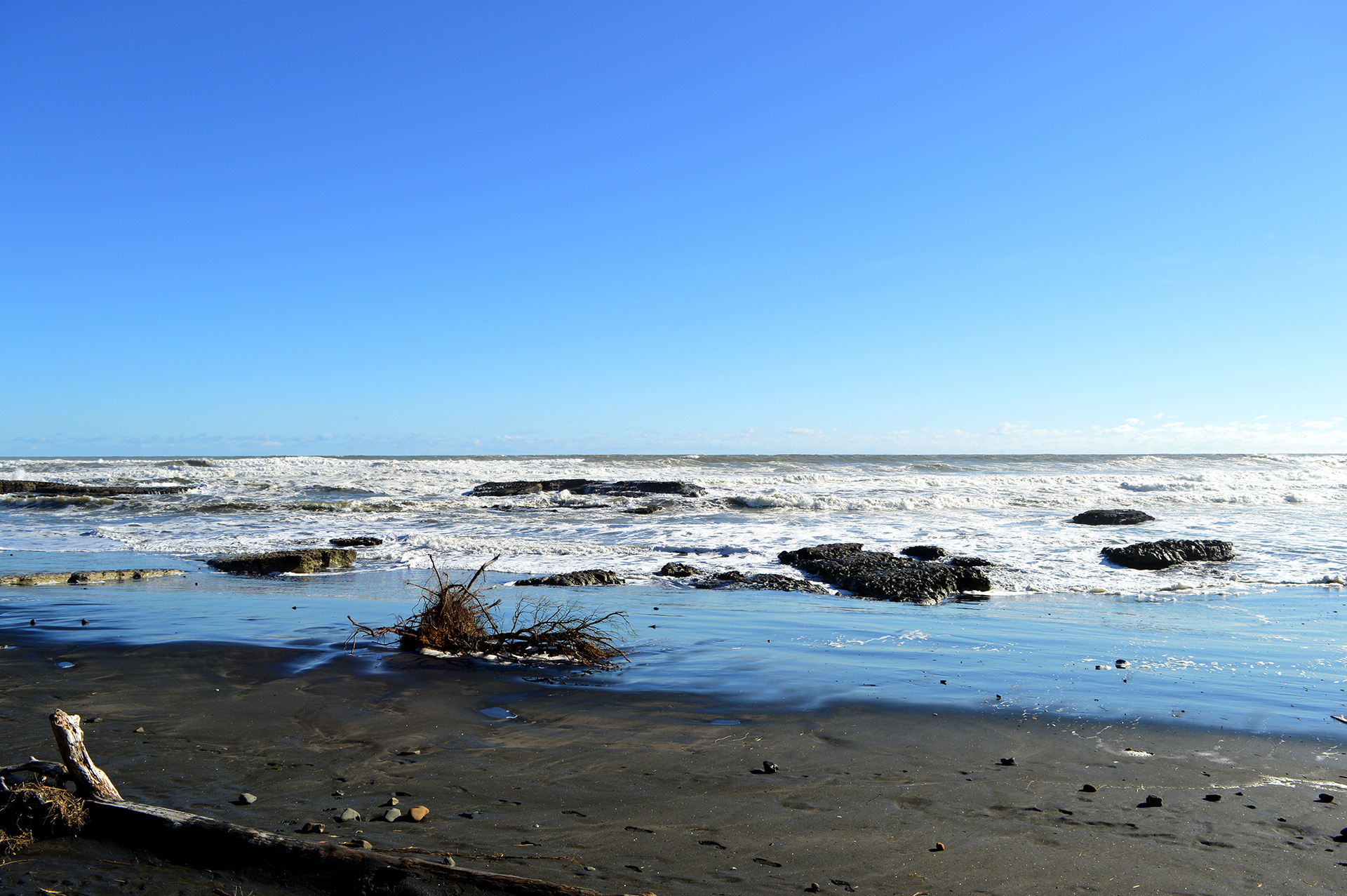 Après avoir pris quelques photos du Mont Venteux avec nos figurines, nous repartons vers Port Waikato. Nous garons la voiture à l’extrême fin de la route goudronnée, juste à deux pas de la plage. Celle-ci est époustouflante car les vagues rugissent au loin, se fracassent sur des petits rochers et roulent jusqu’au pied des petites dunes de sable noir. Et oui, le sable est noir ! C’est la première fois que nous voyons une couleur pareille ! C’est vraiment magnifique. Le noir est profond et parsemé de petits points brillants qui scintillent à la lumière du soleil. Nous jouons un peu avec le sable et l’écume qui vole au grès du vent, puis après une dernière contemplation nous reprenons la route pour rentrer à Waiau Pa.