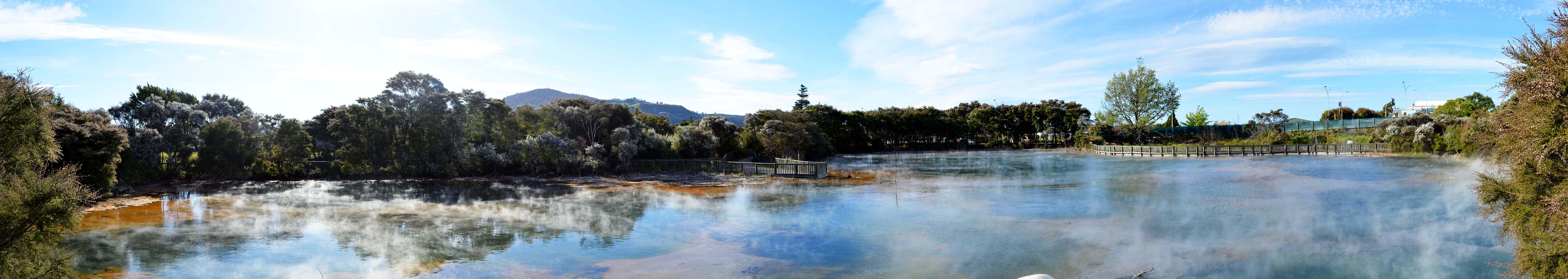 Nous commençons notre balade dans les Government Gardens, qui abritent le très beau bâtiment du Rotorua Museum et les Blue Baths. L’activité thermale est représentée ici par la source Whangapipiro (ou Rachel Pool), dont la température avoisine les 100°C (212° F). Célèbre lieu de de détente, il se compose également de terrains de bowling (sur herbe), de pétanque et de petits bassins très mignons où nous apercevons plusieurs pukekos dont deux petits qui possèdent encore un duvet sombre et un bec noir (celui des adultes est rouge vif). Témoins du passé, nous pouvons également y admirer de belles sculptures maories, une ancienne maison commune où les « gens de la haute » venaient boire un thé servi par des Maories en tenue traditionnelle, ainsi qu’un petit kiosque construit par un célèbre jazz band du 20ème siècle.