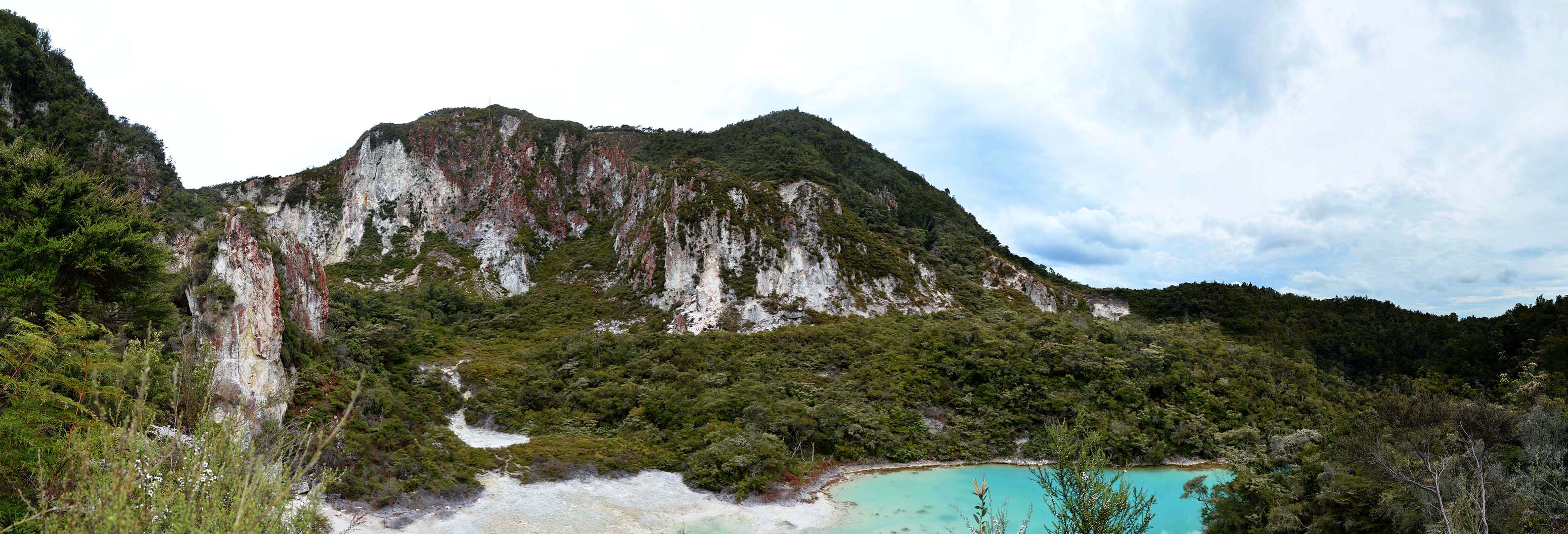 Le lendemain nous partons tôt en direction du parc géothermale de Wai-O-Tapu. L’arrivée sur place est plutôt décevante car nous nous apercevons qu’il s’agit d’un endroit très touristique et par conséquent bondé de touristes. Toutefois, nous sommes bien décidés à profiter au mieux des merveilles qu’il offre. Nous assistons d’abord à l’éruption du geyser Lady Knox, qui est rendue possible grâce à du savon. Cette surprenante découverte a été faite au 19ème siècle, lorsque des prisonniers chargés de nettoyer la zone ont vu leurs vêtements se faire propulser en l’air sur plusieurs dizaines de mètres au cours de leur lessive hebdomadaire. Aujourd’hui cela ressemble plus à un phénomène de foire mais c’est toujours impressionnant de voir en direct à quel point Mère Nature peut-être puissante.
