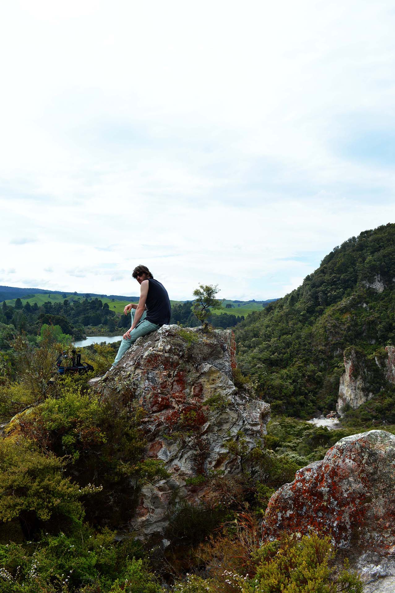 luxuriante se compose de grandes fougères que nous n’avions encore jamais vu, de petits arbustes et de nombreuses plantes qui ne poussent que dans ce type de milieu. La zone autrefois très chaude a tendance à se refroidir aujourd’hui, et c’est pourquoi la forêt reprend le dessus. Pour finir, de grands pics rocheux teintés de rose, de rouge et d’orange se dressent en arrière-plan, comme sortis de nulle part. Par curiosité nous décidons d’avancer plus loin et nous tombons sur un minuscule chemin à travers les buissons qui nous conduit au sommet d’un des rochers que nous venions d’admirer depuis la plateforme d’en-face. Nous seulement la vue est imprenable (et donne même le vertige), mais nous sommes aussi entourés de fumerolles, qui pour une fois ne sont pas cerclées de barrières, mais à l’état brut. Le sol fait quelques gargouillis et lorsqu’on s’en approche, la fumée est très chaude. C’est très enivrant d’être aussi près d’un tel phénomène, qui plus est perché sur un rocher surplombant un lac de cratère !