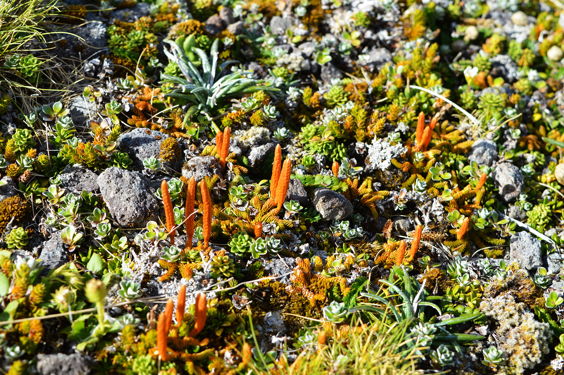 Le chemin suit en fait une route pour 4×4 affreusement défoncée et si notre marche est rapide au départ, plus nous avançons plus nous ralentissons. Le sol est composé de sable ainsi que de gros cailloux plutôt tranchants et la pente est de plus en plus raide. A se demander comment elle finit à l’approche du sommet ! Nous avançons donc tranquillement, d’abord au travers du bush, puis rapidement le décor change et nous franchissons les vastes étendues de tussock, herbe très sèche accompagnée de mousses tendres beige retrouvées sur les parties hautes des bases de volcans.