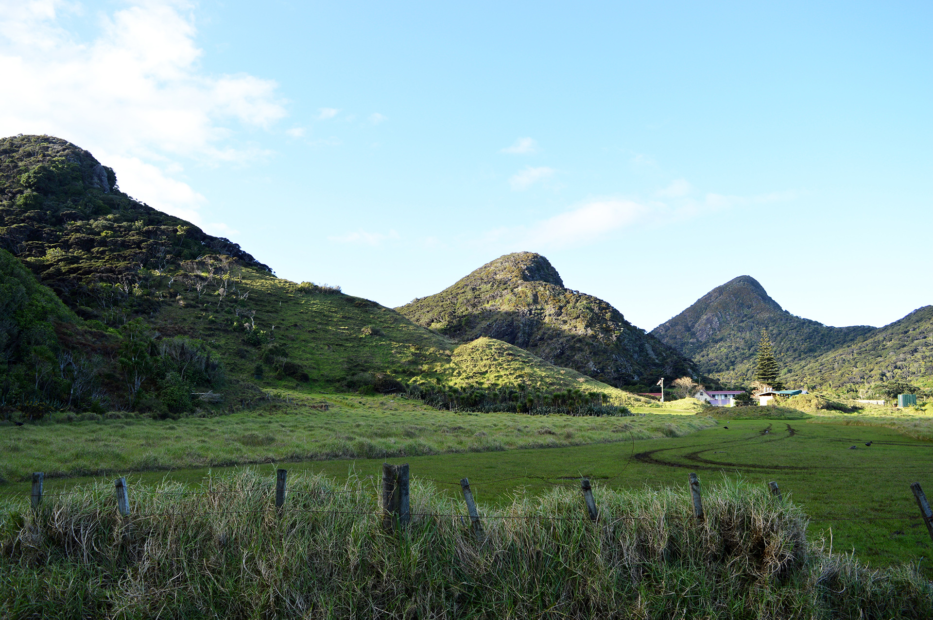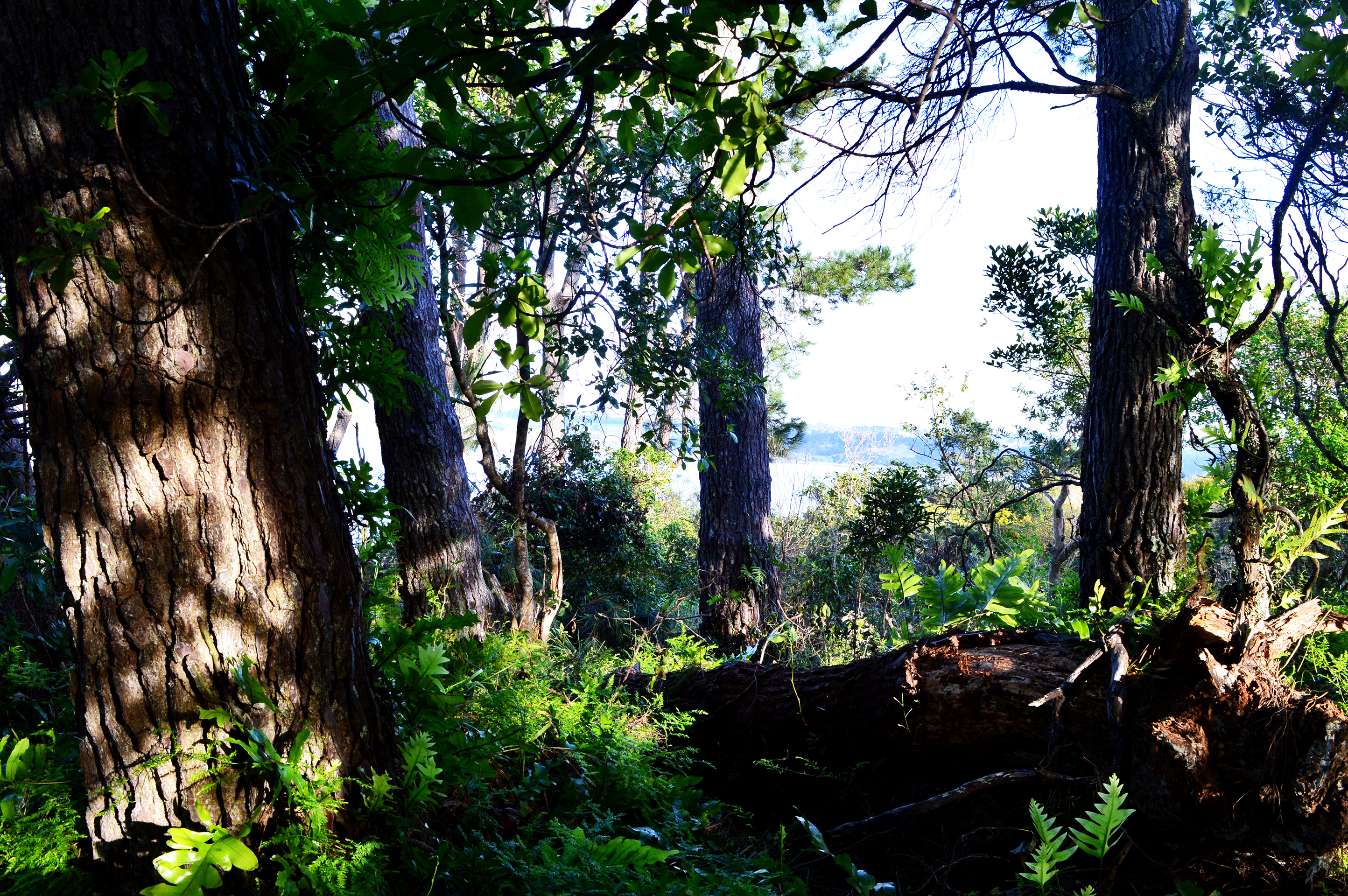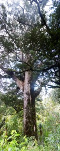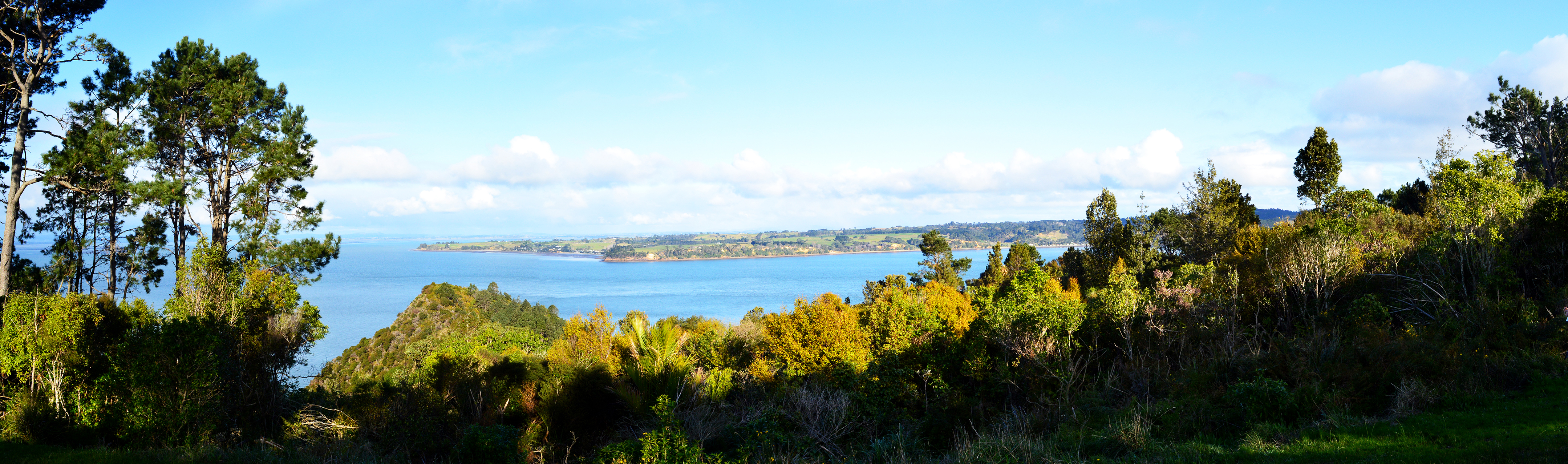 Pour nous y rendre nous roulons sur la très pittoresque Scenic Drive. Cette route est très originale ! Pour bien se la représenter, il faut s’imaginer une forêt luxuriante, très fournie, grouillante de vertes végétation et parsemée d’arbres immenses et de fougères géantes (le bush néozélandais en fait). Une fois que vous avez cette forêt, figurez-vous une route goudronnée très sinueuse passant au milieu de toutes ces plantes. En d’autre termes, nous avons la sensation de rouler en pleine « jungle » et c’est plutôt amusant, sauf quand ça se rétrécit ou qu’il n’y a pas de visibilité sur les voitures d’en face (ce qui arrive souvent). La Scenic Drive fourmille de randonnées et de points de vue panoramique, aussi nous choisissons de faire trois haltes : la première au niveau de la maison de Rose Hellaby (lorsque nous voyons la vue depuis son jardin nous comprenons tout de suite pourquoi elle a été séduite), la seconde pour admirer le plus gros kauri de cette forêt (7m de circonférence, c’est déjà pas mal !) et pour finir nous grimpons le Mt Pukematekeo (qui offre une vue magnifique sur toute la région).