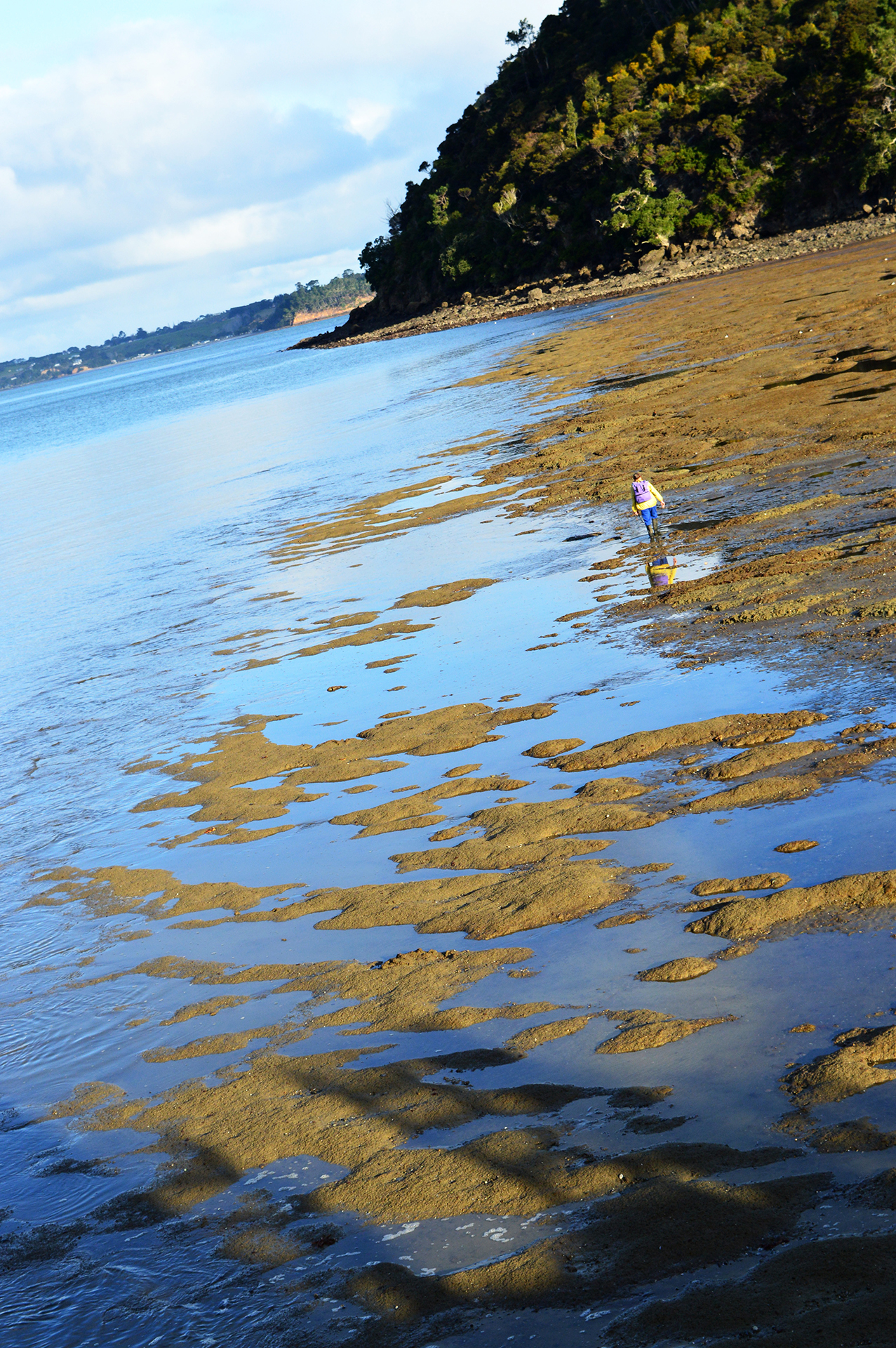 Nous repartons ensuite en direction de Cornwallis pour faire une petite ballade conduisant au McLachlan Monument qui commémore l’arrivée du premier bateau de colons européens. La vue depuis le sommet est magnifique. De loin, nous apercevons tous les lieux que nous avons déjà visités sur le Manukau Harbour : Whatipu et Huia d’un côté, Awhitu Peninsula avec son phare et Orua Bay de l’autre. C’est très amusant de se dire que nous étions en face il y a à peu. Nous redescendons ensuite vers la mer pour marcher le long de la jetée où nous croisons quelques pêcheurs et cueilleurs de coquillages lors de la marée basse. Nous approchons également de très près un beau héron, que nous voyons au large habituellement, ce qui nous fait très plaisir. Pour finir nous marchons une dernière fois (avant la prochaine !) sur la plage de sable noir, histoire de profiter de la vue et de ramasser des coquillages (on ne se refait toujours pas).