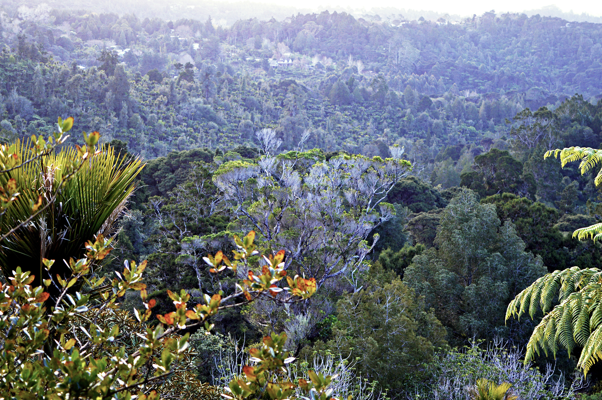 Les Waitakere Ranges sont l’une des deux plus grandes zones primitives de la région d’Auckland et sont renommées pour leur beauté naturelle. Malgré un lourd passé de destruction d’une grande partie de la forêt suite à l’occupation maorie puis à l’exploitation fermière et forestière, des traces de l’originelle et dense forêt pluviale perdure au travers des beaux spécimens de kauris, rimu et kahikatea. Ainsi la forêt luxuriante est un mélange d’une très ancienne et d’une nouvelle végétation.
