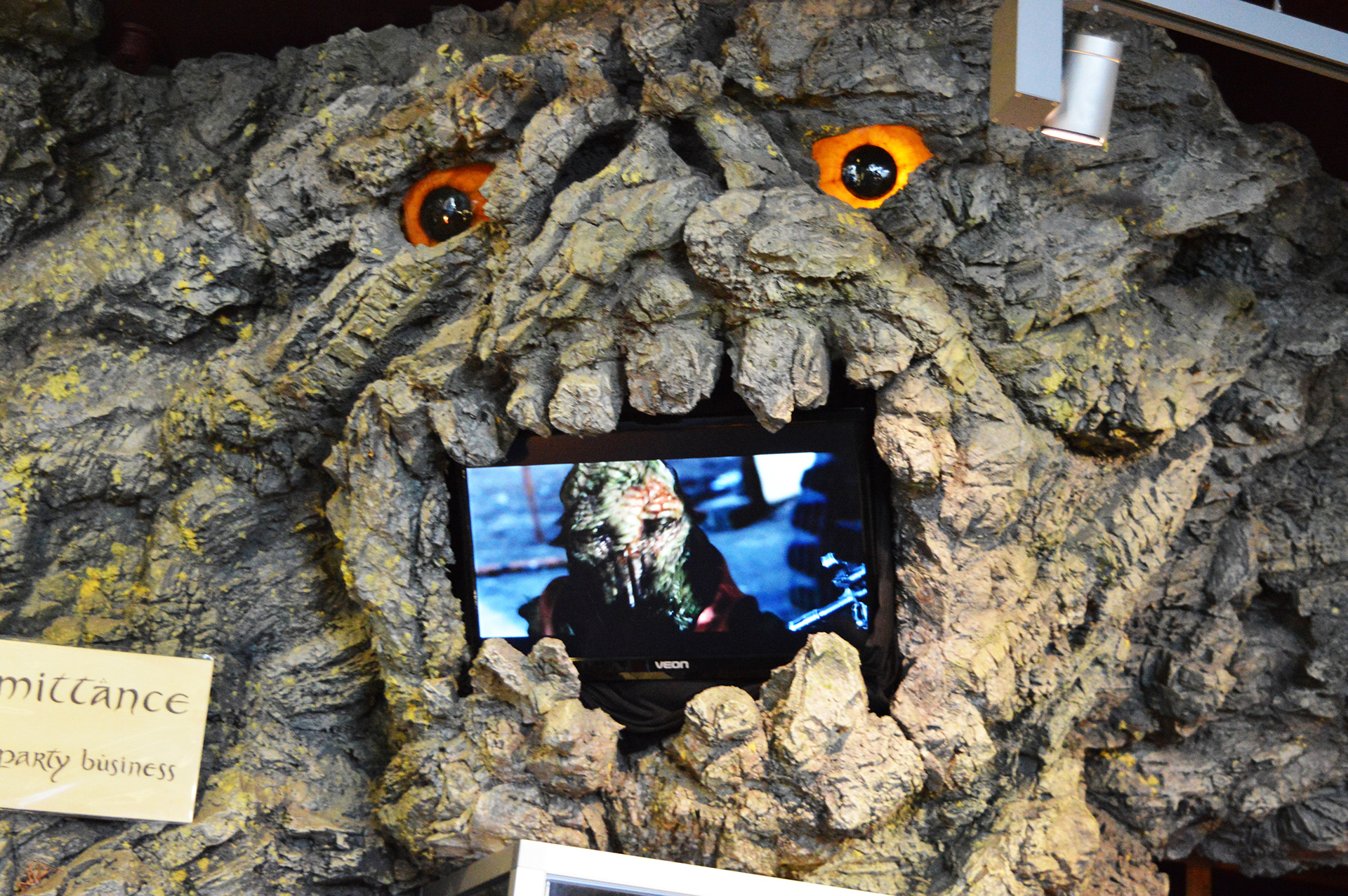 De l’extérieur, les bâtiments ressemblent à de petits entrepôts quelconques, mais dès que nous approchons, nous reconnaissons immédiatement la « touch » de la boîte : deux petits dragons en fer soutiennent l’enseigne et dans le petit jardinet se dressent les 3 trolls de Bilbo changés en pierre par le soleil. Ils ne sont pas aussi grands que dans le film mais sont déjà très impressionnants !