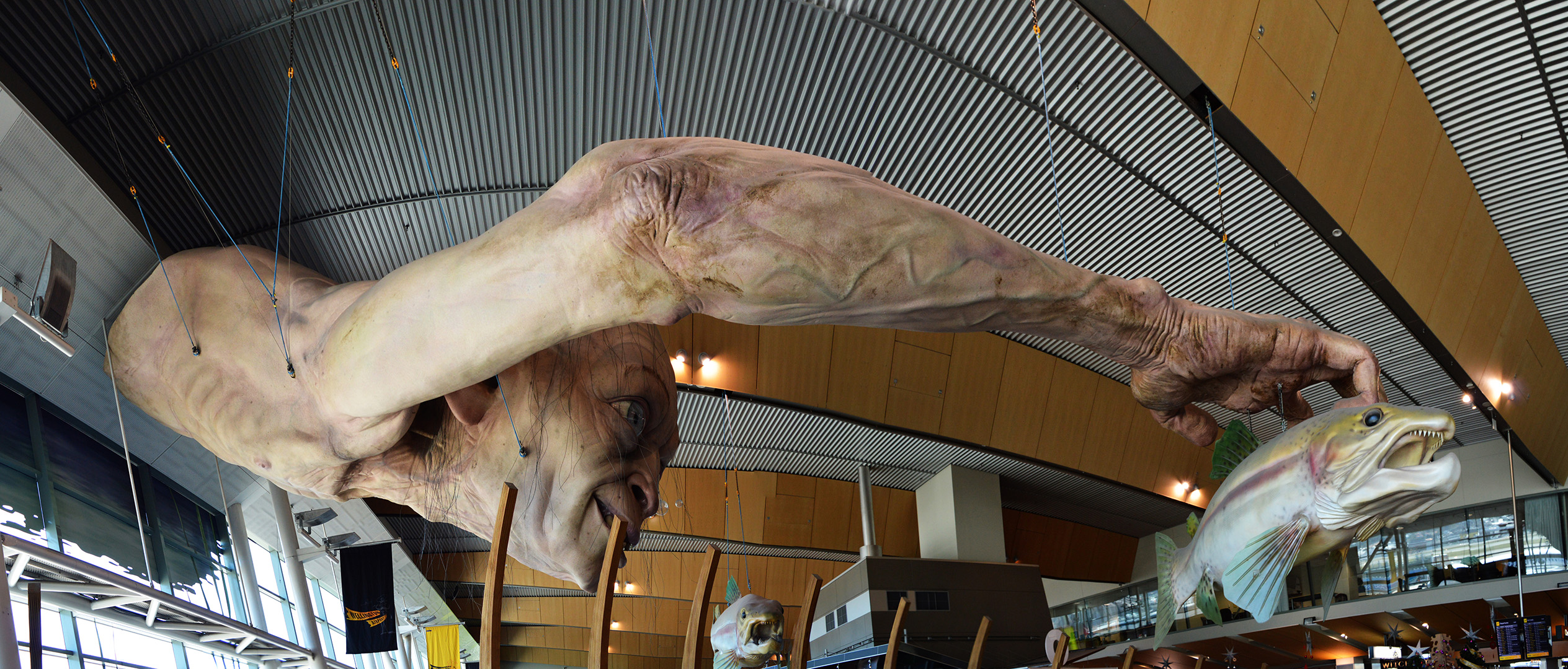 Après ça, direction l’aéroport de Wellington pour découvrir les installations gigantesques des ateliers : un Gollum sortant du mur essayant d’attraper un poisson, deux aigles géants dont un chevauché par Gandalf et pour finir Smaug le Terrible pointant son museau vers le terminal des arrivées. C’est extraordinaire ! Toutes ces créations sont superbement réalisées et semblent plus vrai que nature ! Nous sommes dans l’aéroport mais pour autant nous n’avons pas l’impression d’y être.